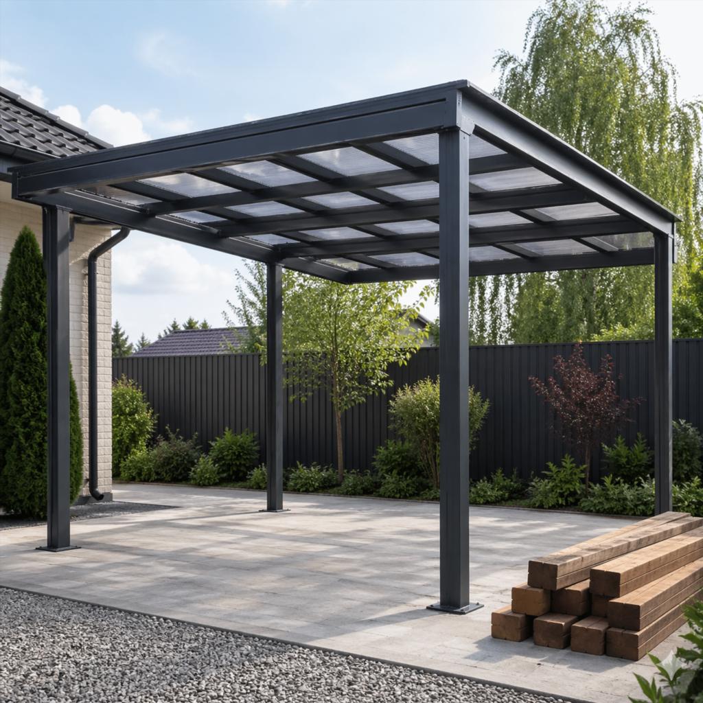 Материал каркаса лучше подбирать под конкретную задачу. Универсального решения нет: то, что подходит для легкого козырька, может оказаться слабым для парковочного навеса.