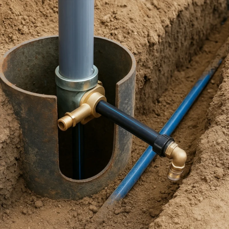 Скважинный адаптер — это специальное приспособление из латуни или нержавеющей стали, предназначенное для герметичного вывода трубы из скважины горизонтально в сторону дома. Его главная особенность — возможность установки ниже уровня промерзания, что делает систему надежной даже при сильных морозах.